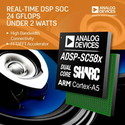 par seconde en virgule flottante grâce à l’association de deux cœurs de processeur SHARC+® et d’accélérateurs DSP (FFT, FIR, IIR) spécialisés. Les processeurs ADSP-SC58x et ADSP-2158x consomment moins de 2 watts sur les gammes de températures étendues, ce qui représente une amélioration du rendement énergétique plus de 5 fois supérieure à celui des processeurs SHARC de génération précédente et plus de 2 fois supérieur à celui de leurs plus proches concurrents.
