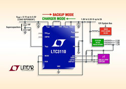 Linear Technology Corporation présente le LTC3110, un chargeur de supercondensateur, abaisseur-élévateur, à intensité d’entrée programmable, avec équilibrage actif de la charge pour une ou deux séries de supercondensateurs. L’architecture propriétaire en mode abaisseur-élévateur, à faible niveau de bruit, assure le travail de deux régulateurs à découpage séparés, ce qui permet des économies sur l’espace, le coût et la complexité. Le LTC3110 fonctionne suivant deux modes, le mode sauvegarde et le mode charge. En mode sauvegarde, le composant maintient la tension du système VSYS, de 1,71V à 5,25V, alimenté à partir de l’énergie emmagasinée dans le supercondensateur.