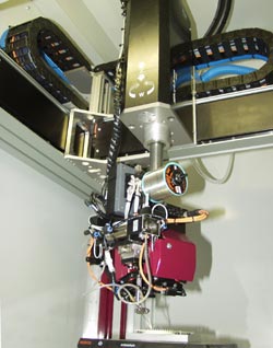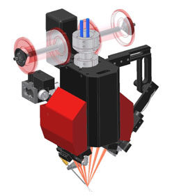 Pour réduire des brûlures collatérales décrites dans les deux premiers points, un nouveau concept de source laser est utilisé. A la place du rayon laser unique, la tête de brasage propage six rayons laser indépendants et orientables dans différentes directions. L’intensité du rayonnement induit qui à l’origine des brûlures sera alors réduite à un sixième de la puissance totale. Bien entendu, le bloc optique a du être fortement retravaillé pour inclure les six optiques indépendantes. De plus, le bloc devait rester compact et léger car il est assemblé sur le robot 4 axes.