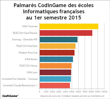 Au premier semestre 2015, L’INSA Toulouse se classe première des écoles françaises, avec un score moyen de ses étudiants de 9075 Coding Points, suivie de TELECOM Saint-Etienne (8161 CP), Ensimag Grenoble INP (5879), TELECOM ParisTech (5558), Polytech Paris Sud (5393), INSA Rouen (5173), TELECOM Nancy (4918), INSA Lyon (4873), l’Université Paul Sabatier Toulouse (4842) et l’Université Lyon 1 Claude Bernard (4697).