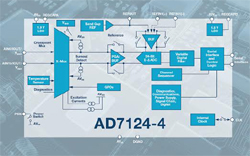 Les frontaux analogiques AD7124-4 et AD7124-8 disposent d’une chaîne de signal entièrement intégrée qui héberge sur un seul et même composant un convertisseur analogique/numérique sigma-delta 24 bits, un amplificateur de gain programmable (PGA), une référence de précision, des tampons (buffers) de référence, des sources de courant, un capteur de température et des sources d’énergie d’excitation. Les fonctions de diagnostic intégrées prennent en charge la compatibilité SIL (Safety Integrity Level) et réduisent le recours à des composants de diagnostic discrets, avec à la clé un gain d’espace sur la carte électronique.