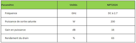M/A-COM Technology Solutions Inc., fournisseur leader de semiconducteurs analogiques, RF, hyperfréquences et optiques, hautes-performances, vient d’annoncer aujourd’hui que des échantillons de son nouveau NPT2024, un transistor large-bande optimisé pour fonctionner du continu à 2.7 GHz grâce à la technologie GaN-sur Si (Nitrure de galium sur silicium) propriétaire de MACOM, étaient livrables dès aujourd’hui. Le NPT2024 fonctionne en mode CW, en mode pulsé ou en mode linéaire, et revendique des niveaux de puissance jusqu’à 200W.