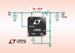 Il fonctionne à partir de tensions d’entrée de 3V à 40V, de ce fait il convient aux applications dont les sources d’entrée vont d’un seul élément Li-ion aux tensions de batteries pour l’automobile. Le LT8330 peut être configuré en convertisseur élévateur, SEPIC ou inverseur. Il utilise une fréquence de commutation fixe de 2 MHz, ce qui permet aux concepteurs de réduire la taille des composants externes et d’éviter les bandes de fréquences critiques, comme la bande radio AM. Le fonctionnement en Burst Mode® réduit le courant de repos à seulement 6µA, tout en maintenant le niveau d’ondulation de sortie inférieur à 15mV crête-à-crête. La combinaison d’un boîtierDFN, 3mm x 2mm, ou TSOT-23 et de petits composants externes assure d’obtenir une empreinte très compacte et de réduire le coût de la réalisation.