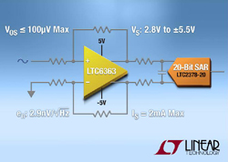 Linear Technology présente le LTC6363 , un amplificateur différentiel vrai, de grande précision, de faible puissance, optimisé pour le contrôle des CAN SAR (convertisseur analogique- numérique à registre à approximations successives) et de 16 bits, 18 bits et 20 bits, aux performances élevées. Avec une tension de décalage de zéro (Offset) en entrée de 100µV max. et un niveau de bruit en entrée de 2,9nV/ Ö Hz, le LTC6363 consomme seulement 19mW sur une alimentation de 10V. Il peut transformer des signaux unipolaires en signaux différentiels en sortie ou être utilisé en mode différentiel complet, convertissant un échelon de sortie différentiel de 8V crête-à-crête avec une résolution de 18bits, en seulement 780ns. Le gain du LTC6363 est fixé par quatre résistances externes. La famille LT5400 à quatre résistances appariées peut être utilisée pour atteindre une linéarité excellente. Le LTC6363 est stable qu’il soit configuré au gain unité, à un gain plus élevé ou en mode atténuation.