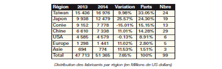 En termes du nombre de fabricants dans le NTI-100 2014, la Chine est passée numéro un en dépassant Taïwan et le Japon. Sur le plan de la production totale, Taïwan a gardé sa position de leader et la gardera, j’en suis persuadé, les prochaines années.