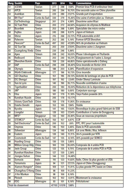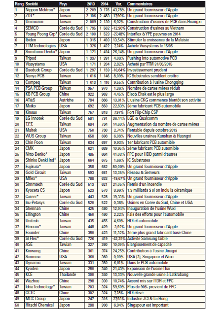 2015 verra divers scénarios. La fusion TTM-Viasystems effective depuis le 31 mai 2015 le placera dans le haut du classement. Avec l’achat d’Invotec, Amphenol sera dans le top 100 en 2015. Plusieurs fabricants chinois sont également sur le point d’y entrer.