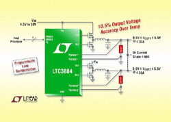 Le LTC3884 fonctionne sur une gamme de tensions d’entrée, de 4,5V à 38V, et génère des tensions de sortie jusqu’à 5,5V. Jusqu’à 6 phases peuvent être mises en parallèle, en opposition de phase pour minimiser le filtrage en entrée et en sortie. Lorsque les deux sorties du LTC3884 sont en parallèle, l’écart entre les courants des phases est inférieur à ±5%. De même, le LTC3884 peut être associé au LTC3874, multiplicateur de phase, ce qui le rend approprié aux demandes d’intensité élevée, jusqu’à 240A. Les amplificateurs différentiels, présents sur la carte, fournissent une mesure vraie de la tension déportée des deux sorties. Les applications comprennent la distribution de puissance, les alimentations redondantes (n+1), les alimentations des FPGA, ASIC et processeurs.