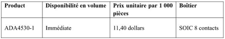 Analog Devices, Inc. (NASDAQ : ADI) annonce ce jour disponibilité d’un amplificateur opérationnel électromètre permettant aux instruments d’analyse chimique d’afficher le plus haut niveau de précision et de répétabilité des données dans une large plage de température. Proposé dans un boitier compact qui réduit la nomenclature et l’encombrement, l’ampli-op ADA4530-1 affiche un courant de polarisation d’entrée plus de 20 fois inférieur à celui des produits concurrents. Cette caractéristique en fait une solution d’interface idéale pour les capteurs sensibles aux charges de sortie tels que les photodiodes et autres capteurs à impédance de sortie élevée souvent utilisés dans des équipements d’analyse/mesure de haute précision (spectrophotomètres, chromatographes et autres spectromètres de masse), ainsi que dans les appareils de mesure de coulométrie à potentiel contrôlé (potentiostatique) et à intensité constante (ampérostatique). Ce nouvel ampli-op peut également être utilisé comme amplificateur d’entrée de systèmes d’instrumentation de type pico-ampèremètre et coulomètre ; comme amplificateur à transimpédance pour photodiodes, chambres d’ionisation et mesure des électrodes de travail ; ou comme buffer haute impédance pour capteurs chimiques et capacitifs.
