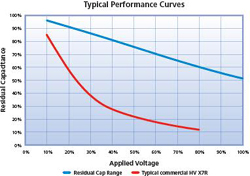 La capacité de ces MLCC (Multi Layer Ceramic Capacitor, ou condensateur céramique multicouches) X7R reste au moins égale à 50% de la valeur maximale, de 1Veff 1 kHz, jusqu’à la tension DC nominale, à température ambiante.