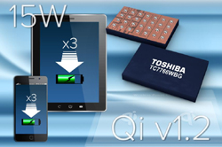 Toshiba Electronics Europe a annoncé le lancement du premier CI récepteur de puissance sans-fil 15W du marché, conforme aux spécifications Qi v1.2 éditées par le consortium WPC (Wireless Power Consortium). Le nouveau TC7766WBG est conçu pour les dispositifs mobiles comme les smartphones, les tablettes et toute une gamme de dispositifs industriels mobiles.