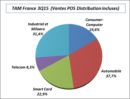 Après un excellent premier trimestre qui s’élevait à 531,6 M€ et un second à 511,3 M€ affichant une baisse séquentielle de -3,8%, au troisième trimestre 2015, le marché français incluant les ventes directes aux OEMs et celles de la Distribution enregistre, une nouvelle baisse de -5,3% par rapport au trimestre précédent. Cependant le Tam France estimé à 481,1 M€, affiche une croissance de +7,8% versus le troisième trimestre 2014 et reste encore supérieur à chacun des trimestres de l’année 2014 et 2013 pris individuellement.