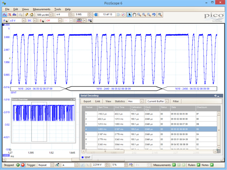 Les bus série sont courants dans les systèmes embarqués et de nouvelles normes sont fréquemment introduites, chacune étant optimisée pour une classe d’application spécifique et un équilibre entre performances, fiabilité et coûts. PicoScope prend en charge un total de seize protocoles, parmi lesquels SENT, 10- et 100BASE-T Ethernet, DMX512 (systèmes d’éclairage) et DCC (modélisme ferroviaire). La prise en charge d’anciennes normes, comme I2C, SPI, CAN et UART / RS-232, a été mise à jour et améliorée.