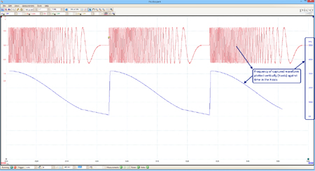Le facteur de fréquence et de forme par rapport au tracé en temps réel est une nouvelle fonctionnalité qui permet l’analyse en un coup d’œil des données volumineuses de forme d’onde. Grâce à ces représentations graphiques, il est possible de mesurer la gigue d’horloge et le dérapage, le taux de modulation et les caractéristiques des signaux FM cycle par cycle.