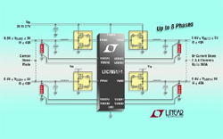 Ce composant fonctionne aussi bien avec des composants externes de puissance, comme les DrMOS et les modules d’alimentation qu’avec des MOSFET canal N discrets et les contrôleurs de grille associés, ce qui permet des configurations souples au niveau de la conception. Jusqu’à huit phases peuvent être mises en parallèle à partir de deux circuits intégrés et en opposition de phase pour minimiser le filtrage en entrée et en sortie pour des demandes de très fortes intensités, jusqu’à 260A. Les applications comprennent les systèmes industriels de distribution de l’énergie des FPGA, des DSP, des ASIC et des processeurs.
