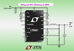 Le LT8641 utilise des commutateurs de puissance, internes, haut et bas, au rendement élevé, avec la diode élévatrice, l’oscillateur, les circuits de contrôle et de logique nécessaires, intégrés sur une seule puce. Le fonctionnement en Burst Mode, à faible ondulation, maintient un rendement élevé pour de faibles intensités de sortie, tout en maintenant l’ondulation de sortie en dessous de 10mVcrête-à-crête. Des techniques de conception spéciales et un nouveau procédé très rapide permettent un fort rendement sur une large gamme de tensions d’entrée et l’architecture à mode intensité du LT8641 permet une réponse rapide aux transitoires et une excellente stabilité de la boucle de régulation. Les autres caractéristiques incluent une compensation interne, un indicateur de tension établie, un démarrage progressif, un suivi de la tension en sortie et un arrêt thermique.