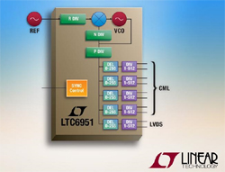 Le LTC6951 possède quatre sorties de niveau logique en mode courant (CML), chacune équipée d’un ensemble diviseur numérique et retardateur d’horloge indépendants, à faible niveau de bruit, pour couvrir une large gamme de fréquences, de 1,95MHz à 2700MHz. Avec un niveau de gigue absolu de 115fseff, le LTC6951 génère les signaux d’horloge, à faible gigue, essentiels pour réaliser la synchronisation des convertisseurs de données, avec le meilleur SNR. (rapport signal sur bruit), aux fréquences élevées en entrée et forts débits de données en sortie.