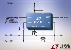 Un contrôleur durci, à circuit OU à diodes idéales destiné aux cartes de télécommunications et de transmission de données, à deux alimentations de forte puissance. Le LTC4371 procure une continuité sans faille entre des alimentations redondantes, remplace les diodes Schottky de puissance et radiateurs associées par des MOSFET canal N, ce qui réduit grandement les pertes de puissance, la chute de tension et la taille de la réalisation. Le contrôleur est conçu pour résister à des surtensions de ±300V ou plus, rencontrées lors de pics induits d’éclairage, de commutation de charges ou une alimentation en court-circuit, pour la solution à circuit OU à diodes la plus robuste disponible. Une alimentation shunt régulée, intégrée, de faible courant de repos 350µA et broches de drain de forte impédance, autorise des résistances externes, de fortes valeurs, pour ajuster la limite de courant de sécurité lors de la survenue de fortes surtensions. Il n’est plus besoin des suppresseurs de surtension, externes, ce qui permet d’économiser sur le coût et la surface de carte.