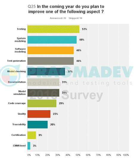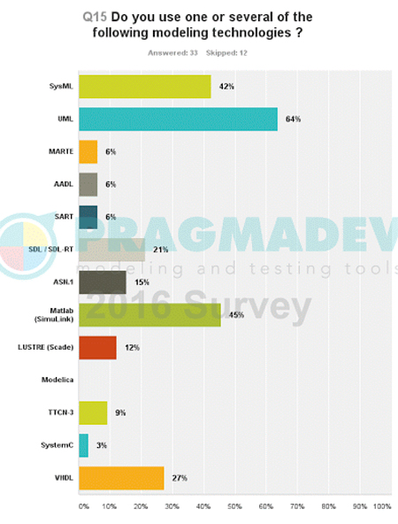 La dernière enquête de PragmaDev sur les technologies de modélisation et de test montre que le test, la modélisation système, et la modélisation logiciel sont les prochains sujets de travail des équipes de développements. Les technologies de modélisation les plus utilisées sont par ordre décroissant UML, Matlab, SysML, et VHDL. L’enquête a aussi confirmé une tendance décroissante significative sur l’utilisation d’UML et de Matlab. L’enquête confirme enfin que les modèles UML et SysML sont les plus informels, les modèles Matlab sont utilisés pour la simulation, et les modèles SDL pour la génération de code.