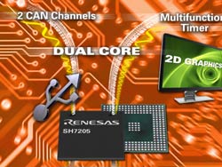 Le SH7205 incorpore deux coeurs SH-2A à 200 MHz atteignant chacun 480DMIPS. Ce qui signifie qu’un seul composant peut atteindre 960 DMips en performance crête. La puce comporte aussi deux unités à virgule flottante (FPU) simple / double précision. Les ingénieurs développant leurs algorithmes sur des PC avec des outils de haut niveau d’abstraction exigent en effet que le contrôleur dispose de FPU. Sans FPU, les algorithmes ralentissent significativement lorsque l’application migre du PC vers une plate-forme embarquée.