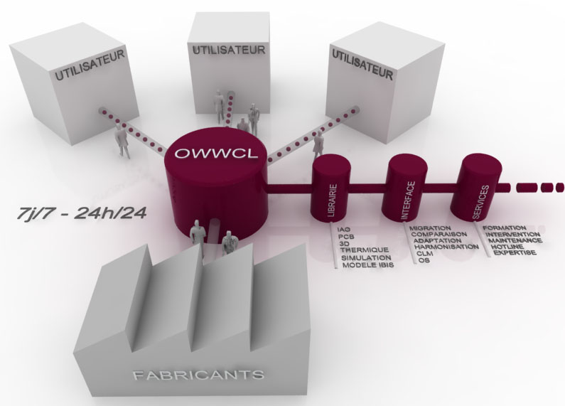 Faire bénéficier les utilisateurs de composants, d’une plateforme mondiale dans laquelle chacun vient piocher le composant dont il a besoin et ce, quelque soit le logiciel de CAO électronique souhaité. Un composant disponible avec toutes ses propriétés, prêt à être immédiatement implanté dans une carte, sans autre intervention par les professionnels de la CAO électronique. Cette plateforme mondiale consiste à mutualiser une prestation que chacun réalisait avant Owwcl, seul dans son coin, reproduisant le même travail que son voisin et pas toujours de manière rigoureuse. Là encore, l’objectif est clairement défini : une réduction significative des coûts !