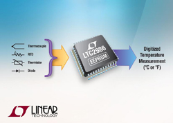 Linear Technology Corporation présente le LTC2986, un circuit intégré de mesure numérique de la température, aux performances élevées, qui numérise directement n’importe quels signaux en provenance de différents thermocouples, RTD (détecteur de température à résistance), thermistances et diodes externes, avec une précision de 0,1°C et une résolution de 0,001°C. Le LTC2986 est conçu à partir des LTC2983 et LTC2984, produits lauréats pour leur innovation, avec l’adjonction de trois nouveaux modes de fonctionnement et la réduction du nombre d’entrées analogiques de 20 canaux à 10 canaux. Les nouveaux modes de fonctionnement prennent en compte les résistances externes utilisées pour une meilleure protection contre les surtensions, résistances qui peuvent être partagées entre plusieurs types de capteurs, capteurs de température alimentés sur des tensions de sortie analogiques, et d’autres capteurs sans relation avec la température comme les capteurs de pression ou d’autres capteurs à sortie tension.
