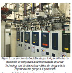 Un SmartMesh IP™ a été déployé à l’usine de fabrication (fab) de composant à semiconducteurs de Linear Technology dans la Silicon Valley, pour surveiller la pression des centaines de bouteilles de gaz spéciaux utilisés lors des diverses étapes de gravure et de nettoyage de la fabrication des composants à semiconducteurs. Auparavant, la pression de chaque bouteille était vérifiée manuellement trois fois par jour, ce qui représentait un total de 4 heures d’intervention manuelle par jour. Un réseau SmartMesh IP a été déployé pour automatiser les mesures et envoyer les valeurs lues directement au logiciel du centre de commande de l’usine.