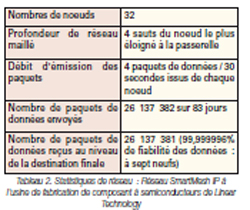 La fiabilité de centaines de topologies de réseaux est vérifiée à l’aide du banc de test. Le réseau suivant (tableau 1), par exemple, a été mis en oeuvre pour effectuer le test de performance d’un réseau à 100 noeuds et à quatre sauts classiques. Chaque noeud générait 2 paquets de données par minute et le réseau a fonctionné pendant un minimum de 500 heures (sur 21 jours). L’environnement simule une installation commerciale ou industrielle légère classique, avec présence d’équipement électronique, de structures métalliques et de personnes se déplaçant dans tout le bâtiment. Malgré les pertes dues à l’environnement RF, le réseau, a pu atteindre une fiabilité de données supérieure à 99,999% au cours de l’envoi de plus de 43 millions de paquets de données, en multipliant les relances de paquets et en utilisant la diversité de chemin et de canaux.