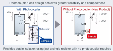 Les solutions conventionnelles utilisent un optocoupleur et d’autres composants de commande de puissance isolée de type Flyback pour la boucle de réaction. Cependant, cela génère des difficultés qui sont associées à la fiabilité et à la consommation actuelle (y compris l’échelle du circuit et le cycle de vie du produit). La série BD7F, grâce à son architecture sans optocoupleur, permet aux concepteurs de simplifier le développement du transformateur et de réduire les coûts.