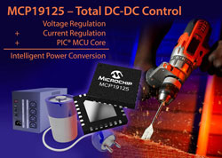 Régulateur linéaire, drivers de MOSFET, coeur microcontrôleur PIC® 8 bits, CADC (convertisseur analogique-numérique), oscillateur de précision, et asservissements analogiques sont intégrés pour offrir une solution compacte.