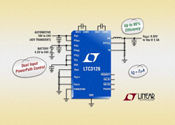 Linear Technology Corporation annonce le LTC3126, un régulateur à découpage, abaisseur, synchrone, 2,5A, 42V, avec un contrôle PowerPathTM intégré, à deux entrées. Une architecture unique, à un seul étage de puissance, permet un fonctionnement à partir de l’une ou l’autre de deux sources d’alimentation indépendantes, avec des transitions sans coupure, contrôlées en interne entre les entrées afin d’assurer une tension de sortie stable lors d’évènements de connexion à chaud ou de déconnexion de l’alimentation. Des commutateurs de puissance internes et un redressement synchrone permettent d’atteindre un rendement de 95% sur une gamme étendue de la tension, d’avoir une réponse rapide aux signaux transitoires et d’assurer une stabilité de boucle excellente, en commutant à 2MHz. Les concepteurs peuvent ainsi éviter les bandes de fréquences critiques, sensibles au bruit, comme la bande radio AM, et réaliser une mise en œuvre d’empreinte très compacte. L’architecture en mode courant du LTC3126 est compensée en interne, ce qui élimine le besoin en composants de compensation externes. Le fonctionnement en Burst Modeâ maintient un rendement élevé pour des courants de sortie de faible intensité, ainsi que l’ondulation crête-à-crête de la tension de sortie en dessous de 1%. De plus, il présente une consommation au repos inférieure à 2µA, à vide et en veille, ce qui est approprié aux systèmes toujours en fonctionnement et les applications portables. Les gammes étendues de la tension d’entrée, de 2,4V à 42V, et de la tension de sortie, de 0,818V à la tension d’entrée VIN, conviennent aux applications de l’automobile où la régulation doit se faire en cas de démarrage à froid, de rupture de charge et d’arrêt-démarrage. Les autres applications principales comprennent les équipements de test portables de l’industrie et des télécommunications, les systèmes d’alimentation de sauvegarde à supercondensateur et batterie, l’alimentation pour l’automobile avec batterie de sauvegarde, les alimentations sans coupure et les systèmes alimentés par des prises secteur non régulées ou des batteries à un ou plusieurs éléments de compositions chimiques les plus courantes.