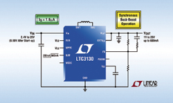 Linear Technology Corporation annonce les LTC3130 et LTC3130-1, des convertisseurs abaisseurs - élévateurs, synchrones, mode courant, qui génèrent un courant continu en sortie jusqu’à 600mA, à partir d’une grande variété de sources d’entrée, incluant les batteries à un ou plusieurs éléments, ainsi que les panneaux solaires et les supercondensateurs. Leurs gammes de tensions d’entrée, de 2,4V à 25V, et de sortie, de 1V à 25V (réglage possible pour le LTC3130), procurent une tension de sortie régulée avec les tensions d’entrée supérieures, inférieures ou égales à la tension de sortie. Le fonctionnement en Burst Modeâ pouvant être sélectionné par l’utilisateur, réduit le courant de repos à seulement 1,6μA (1,2μA à vide), ce qui améliore le rendement aux charges faibles et accroît l’autonomie sur batterie. L’architecture propriétaire, en mode abaisseur - élévateur, utilisée dans le LTC3130/-1 génère un bruit de bas niveau, une commutation sans gigue dans tous les modes de fonctionnement, ce qui est approprié aux applications RF et analogiques de précision qui sont sensibles