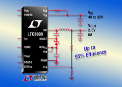 Le LTC3609 utilise des transistors commutateurs internes, à résistances RDS(0N) de seulement 18 mohms et 13 mohms, pour un rendement pouvant atteindre 95%. Il peut également être configuré en mode de fonctionnement discontinu ou continu forcé. Le mode continu forcé réduit le niveau de bruit et les interférences RF, tandis que le mode discontinu permet d’avoir un rendement élevé en réduisant les pertes de commutation aux faibles charges, et ne consommant que 900 µA au repos. Le courant d’arrêt est de seulement 15 µA. Les autres caractéristiques incluent un gestionnaire de tension de sortie à drapeau « alimentation correcte », un réglage de la limite du courant, une protection contre les surtensions en sortie et un démarrage progressif programmable.
