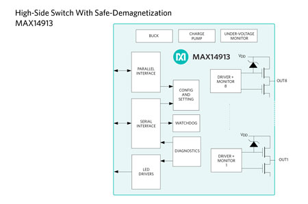 « Le MAX14913 est le premier et le seul commutateur octuple high-side du marché à brides de démagnétisation rapide sécurisées et intégrées, capables de décharger et de démagnétiser n’importe quelle charge inductive, » déclare Tony Partow, Directeur Exécutif de la division Industrie et Santé de Maxim.