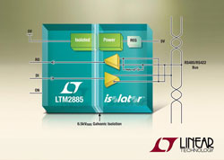 Linear Technology Corporation présente le LTM2885, un émetteur-récepteur µModule® RS485 isolé, destiné à assurer une protection contre les différentiels de tensions entre masses, de forte amplitude. De nombreuses applications industrielles, utilitaires, médicales, militaires et de sécurité intrinsèque requièrent des composants d’isolation qui accroissent la tension et l’espace de séparation pour la sécurité des personnes. Le LTM2885 procure un isolement renforcé de 6500Veff. entre l’interface de niveau logique et les broches de bus de l’émetteur-récepteur, dépassant de beaucoup les normes de base IEC 60747 et les standards d’isolement renforcé. Avec des lignes de fuite et distances de sécurité supérieures à 14mm et une distance d’isolement (DTI) supérieure à 0,2mm, le LTM2285 surpasse, en niveaux de tension, les demandes d’équipements de catégorie II et du groupe de matériels IIIA, comprenant l’implantation de deux moyens de protection du patient (MOPP) pour l’équipement médical à la norme IEC 60601-1.