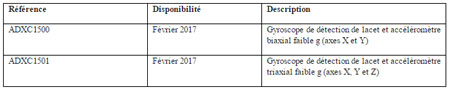 Après des décennies d’innovation dans le secteur des centrales inertielles, Analog Devices confirme sa présence à la pointe du marché avec des accéléromètres et des gyroscopes de conception avancée qui contribuent à sauver des vies. Bénéficiant de la conception Quad-Sensor™ différentielle brevetée, le gyroscope ADXC150x rejette efficacement les accélérations linéaires, notamment les forces gravitationnelles externes et les vibrations. Pour sa part, l’accéléromètre avancé est doté d’un faisceau de capteurs à faible facteur Q qui affiche un niveau exceptionnel de rejet de bruit et une large plage dynamique, et permet de gérer efficacement les signaux de surcharge dans les environnements automobiles les plus sévères. Deux configurations sont initialement disponibles : l’ADXC1500, qui embarque un accéléromètre biaxial avec gyroscope de détection de la vitesse de lacet ; et l’ADXC1501, dont l’accéléromètre triaxial avec gyroscope de détection de la vitesse de lacet. Ces deux modèles dotés d’une sortie numérique SPI sont disponibles en boîtier SOIC 16 contacts à cavité inversée pour de solides performances face aux interférences électromagnétiques (EMI).