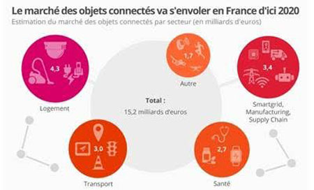Le secteur de IOT en France devrait enregistrer un chiffre d’affaires de 15,2 milliards d’euros en 2020, selon l’Institut Montaigne et le cabinet de conseil américain A.T. Kearney. La domotique devrait générer 4,3 milliards d’euros de revenus, les transports 3 milliards et la santé 2,7 milliards