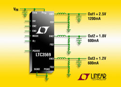 La fréquence de découpage du LTC3569 est programmable entre 1 MHz et 3 MHz ou peut être fixée à 2,25 MHz, ce qui permet au concepteur d’optimiser le rendement tout en évitant les bandes de fréquences critiques, sensibles au bruit. La combinaison de son boîtier QFN-20, 3 mm x 3 mm, (ou TSSOP-16E) et de sa fréquence de découpage élevée permet l’emploi de petits condensateurs et inductances externes, conduisant à des réalisations d’empreinte très compacte et de bon rendement thermique. Les transistors commutateurs internes, synchrones, du LTC3569 assurent des rendements pouvant atteindre 95% alors que le fonctionnement en Burst Mode® réduit la consommation au repos à seulement 100 µA (pour les trois canaux) sans charge. Pour les applications demandant le moins de bruit possible, le LTC3569 peut fonctionner en mode par saut d’impulsion pour réduire l’ondulation de sortie. Le LTC3569 possède un drapeau « tension correcte » et peut être synchronisé à une horloge externe (de 1,2 MHz à 3 MHz), les autres caractéristiques incluent une compensation interne, une protection contre les dépassements thermiques et les courts-circuits.