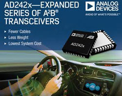 Analog Devices, Inc. (NASDAQ : ADI) annonce trois nouveaux émetteurs-récepteurs pour sa technologie avancée Automotive Audio Bus (A2B®) qui permet de distribuer des données audio et de contrôle, mais également les signaux d’horloge et l’alimentation électrique, sur un unique câble à paire torsadée non blindé (UTP). Les émetteurs-récepteurs A2B de la série AD242x permettent une communication flexible entre nœuds esclaves et prennent en charge les fréquences réduites d’échantillonnage de données. Ces deux caractéristiques améliorent de manière significative l’usage de la bande passante du bus de données et constituent des facteurs de différenciation clés pour des applications émergentes telles que la communication à l’intérieur des véhicules ou l’annulation active du bruit. Le brochage de ces nouveaux circuits est entièrement compatible avec les membres existants de la série, ce qui simplifie la mise à niveau et accélère le lancement sur le marché.