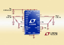 La fréquence de découpage du LTC3546 peut être fixée à 2,25 MHz ou peut être programmée, de 750 kHz à 4 MHz, ce qui permet à l’utilisateur d’optimiser le rendement tout en évitant les bandes de fréquences critiques sensibles au bruit. La combinaison de son petit boîtier QFN-28, 4 mm x 5 mm, et de la fréquence de découpage élevée qui permet d’utiliser de petits composants externes, condensateurs et inductances, conduit à une solution d’empreinte très compacte et de bon rendement thermique. La conception du LTC3546 repose sur deux commutateurs synchrones au primaire de 2 A et 1 A et d’un commutateur synchrone dépendant de 1 A en sortie qui peut être connecté extérieurement aux sorties de l’un ou l’autre des commutateurs principaux pour obtenir en sortie soit 3 A et 1 A ou 2 fois 2 A. Le commutateur de 2 A principal peut fonctionner en phase avec les commutateurs additionnels ou en opposition de phase via une broche de phase externe.