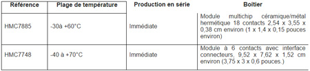 Annoncé sous la référence HMC7885, cet amplificateur hybride étanche 32 W logé en boîtier hermétique pour applications haute fiabilité fournit un gain « petit signal » typique de 21 dB pour une puissance de sortie RF saturée de 45 dBm. Sa consommation de courant de repos est de 2,2 A sous une tension d’alimentation continue de 28 V.. Ses entrées et sorties RF filtrent le continu et sont adapté en impédance 50 ohms pour une utilisation aisée. Une carte d’évaluation disponible avec routage et nomenclature facilite la qualification de l’application.