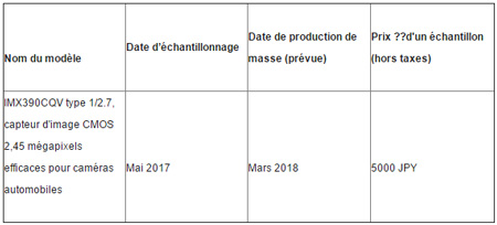 L’IMX390CQV est conçu pour satisfaire aux exigences des tests AEC-Q100 Grade 2 de fiabilité des composants électroniques automobiles pour cette année fiscale. En plus de ce nouveau produit, Sony a également mis en œuvre un processus de développement conforme aux normes de sécurité fonctionnelles ISO26262, visant à obtenir un haut niveau de qualité lors de la conception d’un produit automobile. Ce nouveau capteur est également conforme au niveau d’exigence de sécurité fonctionnelle ASIL C. Grâce à ce plein respect des normes et exigences de qualité pour les composants automobiles, le produit est prêt à être utilisé dans les caméras frontales servant aux systèmes avancés d’assistance au conducteur (Advanced Driver Assistance Systems, ADAS) et dans les systèmes de surveillance par caméra (Camera Monitoring Systems, CMS) qui permettent d’afficher clairement sur un écran du tableau de bord les personnes et les obstacles autour du véhicule, une application qui devrait se développer en remplacement des rétroviseurs classiques.