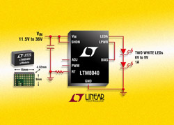 Le LTM8040 peut convertir une tension d’entrée, de 4 V à 36 V, en une tension plus basse, de 2,5 V à 13 V, ce qui convient au pilotage d’une grande variété de DEL de couleur et blanches dont les chutes de tension (VD) sont différentes. Le composant présente également les deux réglages de luminosité, analogique et par contrôle True Color PWM™, permettant de générer une couleur constante, avec un rapport de luminosité de 400 à 1. L’intensité du courant de DEL peut être contrôlée linéairement, de 0 A à 1 A, par une seule résistance. La fréquence de commutation par défaut est de 500 kHz, elle peut être réglée par une résistance pour un fonctionnement jusqu’à 2 MHz.