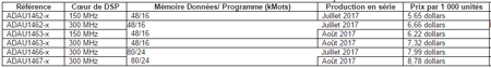 Par rapport à leurs concurrents, les DSP de la série ADAU146x se caractérisent par des performances de traitement parallèle, une flexibilité et une évolutivité système hors pair.. La disponibilité d’un cœur DSP de faible coût cadencé à 150 MHz et d’un cœur DSP cadencé à 300 MHz permet aux concepteurs de systèmes de disposer de solutions de rechange pour les applications traditionnelles ou plus exigeantes. Le cœur cadencé à 300 MHz exécute jusqu’à 1,2 GMACs, exécutant 6 144 instructions à la fréquence d’échantillonnage audio de 48 kHz. Les convertisseurs de fréquence d’échantillonnage asynchrone (ASRC) stéréo intégrés, la matrice de routage des signaux audio et une mémoire RAM intégrée deux fois plus importante que celle des DSP de génération précédente simplifient l’exécution d’algorithmes très exigeants. Le générateur d’horloge flexible avec boucle à verrouillage de phase (PLL) intégré peut produire simultanément jusqu’à 15 échantillons audio.