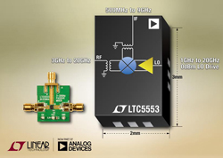 Analog Devices, Inc., qui a acquis récemment Linear Technology Corporation, annonce le LTC5553, un mélangeur symétrique double, procurant la meilleure bande passante de sa catégorie de 3GHz à 20GHz. Le mélangeur peut être utilisé en conversion en mode élévateur ou en mode abaisseur. De plus, le LTC5553 présente une linéarité exceptionnelle avec un IIP3 de 23,9dBm à14GHz, et de 21,5dBm à 17GHz. Le composant intègre un étage tampon OL, nécessitant un niveau de commande de seulement 0dB, ce qui permet d’éliminer le circuit amplificateur externe OL, de forte puissance. De plus, le LTC5553 intègre des transformateurs balun, large bande, dans la puce. Ainsi, tous les ports ont un fonctionnement asymétrique, adaptés 50§Ù sur leur bande de fréquences respective. De plus, le mélangeur réalise un isolement excellent entre les ports, avec des fuites de l’OL à sa fréquence RF de -32dBm à 17GHz, ce qui facilite la réponse en filtrage externe. Toutes ces caractéristiques conduisent à un minimum de composants, à une conception simplifiée et à une taille de réalisation très petite.