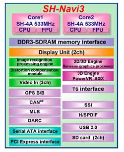 Un système sur puce (SoC) intégrant un double coeur CPU et des fonctions graphiques étendues avec une unité de reconnaissance d’images de haute performance ; il est destiné à la nouvelle génération de terminaux sophistiqués de systèmes d’information automobiles. Incorporant dans une seule puce deux puissants coeurs 32 bits SH-4A, ce composant atteint la très haute performance de 1920 MIPS à 533 MHz. Renesas Technology détient la plus large part du marché mondial des microprocesseurs pour navigation automobile1, et les SoC de la série SH-Navi2, qui implémentent des fonctions clés pour les systèmes de navigation telles que le graphique 3D, sont déjà utilisés dans un grand nombre de produits de haut de gamme.
