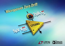 Analog Devices, Inc., ayant acquis récemment Linear Technology Corporation, annonce le LTC2063, un amplificateur opérationnel à dérive de tension nulle, qui ne consomme que 1,3µA typique (2µA max.) sur une alimentation de 1,8V. Cet amplificateur de très basse puissance maintient un niveau de précision sans compromis : le décalage du zéro de tension d’entrée est de 5µV max. à 25°C, la dérive est de 0,06µV/°C max., de -40°C à 125°C. Le courant de polarisation d’entrée est de 15pA max., à 25°C, et de 100pA de -40°C à 125°C. Ces caractéristiques d’entrée, de grande précision, permettent l’emploi de résistances, de forte valeur, dans la boucle de retour, ce qui maintient une basse consommation, sans compromis avec la précision, même à température élevée.