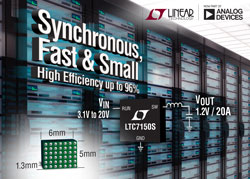 La durée de conduction très courte, minimale de 25ns, du LTC7150S permet une alimentation, de rapport élevé en mode abaisseur, à des fréquences élevées, pouvant accepter les deux modes de fonctionnement, continu forcé et discontinu. La fréquence de fonctionnement peut être choisie entre 400kHz et 3MHz, et peut être synchronisée sur une horloge externe. La précision totale de la tension de sortie différentielle du LTC7150S est de ±1% sur la plage de température de jonction de -40°C à 125°C. Les autres caractéristiques incluent la mesure déportée de la tension différentielle VOUT directement au niveau de la charge, une broche de sélection de la phase PHMODE, un seuil précis de 1,2V de la broche RUN de, une protection contre les surtensions sur VIN, un indicateur de tension établie et un démarrage progressif / suivi de la tension programmable.