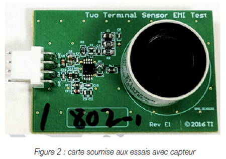 La figure 2 présente le circuit des essais, construit sur une carte standard FR-4 de 62 mils à deux couches, dotée de plans de masse de chaque côté pour tester la performance électromagnétique. Un connecteur à quatre broches permettait le changement rapide des cartes, tandis que le branchement des broches du capteur permettait le retrait aisé de celui-ci.