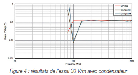 Afin de vérifier l’efficacité de notre technique d’atténuation des interférences électromagnétiques intégrée, nous avons comparé le LPV802 avec deux appareils populaires, commercialisés par nos concurrents, et qui présentent la particularité d’être dépourvus de protection interne contre les interférences électromagnétiques.