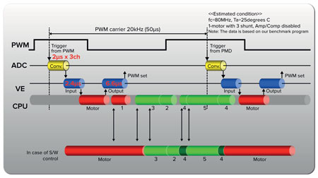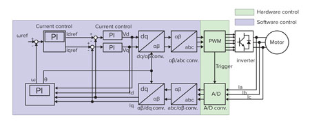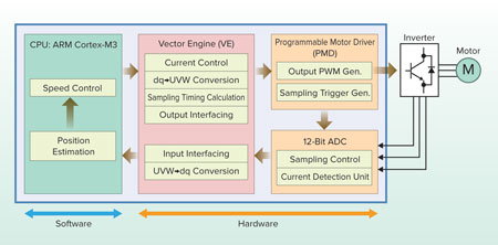 Afin d’éviter de dépendre du niveau de performance du processeur principal, des plateformes matérielles dédiées à la commande moteur FOC ont été développées. Le VE (Vector Engine, ou moteur vectoriel) de Toshiba par exemple, permet de traiter les équations de commande vectorielle complexes dans un moteur matériel dédié à micrologiciel personnalisable. La solution intégrée comprend aussi a un bloc PMD (Programmable Motor Drive, ou commande moteur programmable) capable de générer les signaux PWM et d’exécuter d’autres fonctions nécessaires comme le contrôle de temps-mort. En réduisant le contenu logiciel, le VE garantit une exécution stable et prévisible du code, qui ne peut être affecté par d’éventuelles interruptions, ni par la qualité du logiciel. Puisque le logiciel standard est fourni en tant qu’élément de l’environnement de développement, les concepteurs peuvent se concentrer sur leur propres compétences pour commercialiser leurs produits plus rapidement.